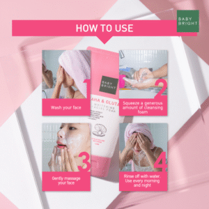 تستخدم رغوة تبيض ومنظف للوجه بيبي برايت برائحة حمض اللاكتيك وجلوتا مرتين يوميًا، صباحًا ومساءً.