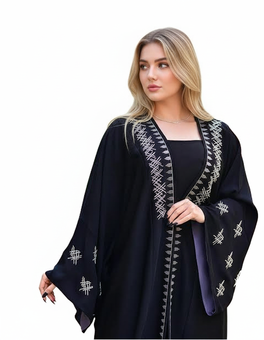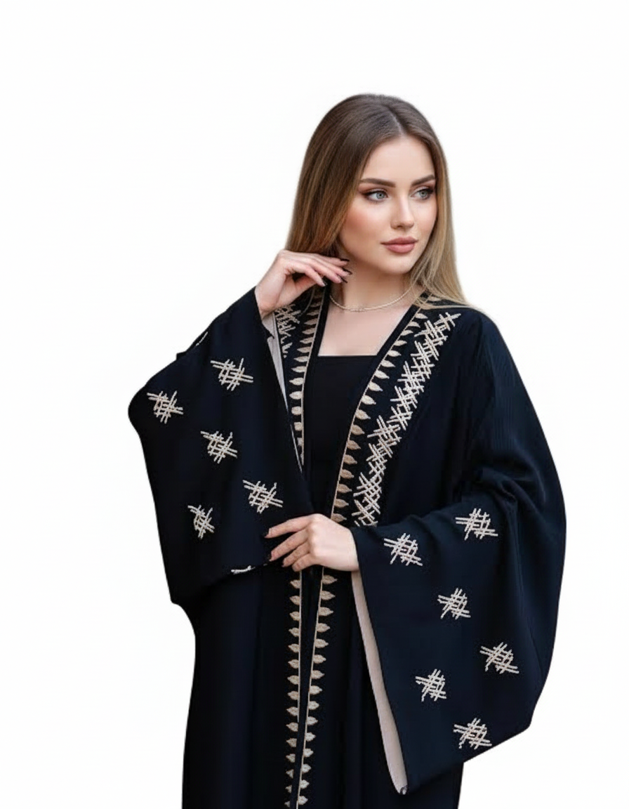 تجسّد هذه العباية الأناقة الخليجية بروح عصرية راقية، حيث يأتي اللون الأسود الكلاسيكي متناغمًا مع تطريزات هندسية دقيقة بلون نحاسي ي، تضيف لمسة فخامة لافتة دون مبالغة.