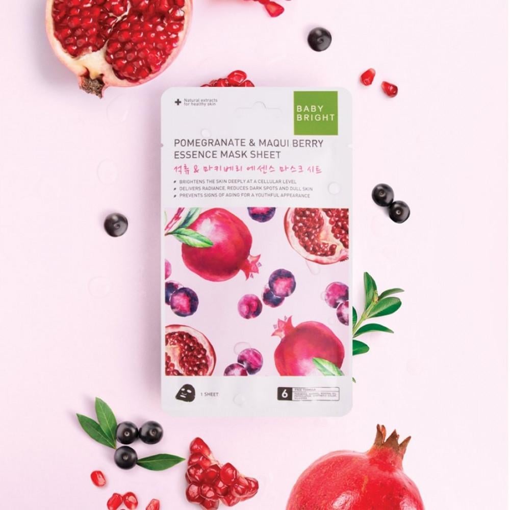 “ورقة قناع Baby Bright Pomegranate & Maqui Berry Essence هي تمتاز بقدرتها على تفتيح البشرة بعمق، حيث تمنحك بشرة متوهجة طوال الليل بفضل تركيبتها الغنية بمضادات الأكسدة من الرمان. وليس ذلك فقط، بل إنها تحتوي على فيتامين C ومضادات الأكسدة المركزة (ORAC-H) من Maqui Berry التي تعمل على تقليل البقع الداكنة والبهتان وتأخير ظهور التجاعيد المبكرة، مما يمنحك مظهرًا شبابيًا عند استخدامها بانتظام.”