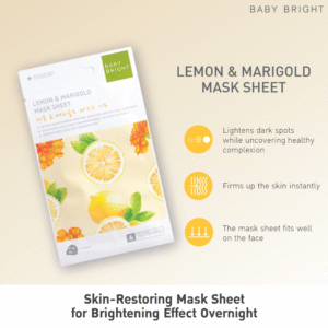 “ماسك بيبي برايت بخلاصة الليمون والماريجولد هو السر الذي يمنح بشرتك التغذية السريعة التي تحتاجها لتحقيق بشرة متماسكة وناعمة ومشرقة، مما يعزز من شبابها وجمالها.