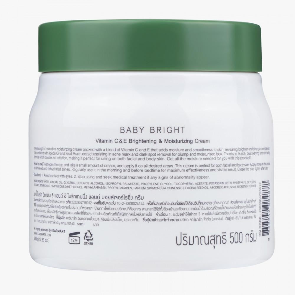 - يوضع افضل كريم تفتيح وترطيب فيتامين C و E من بيبي برايت على بشرة نظيفة وجافة. يمكن استخدامه صباحًا ومساءً.