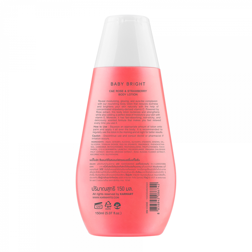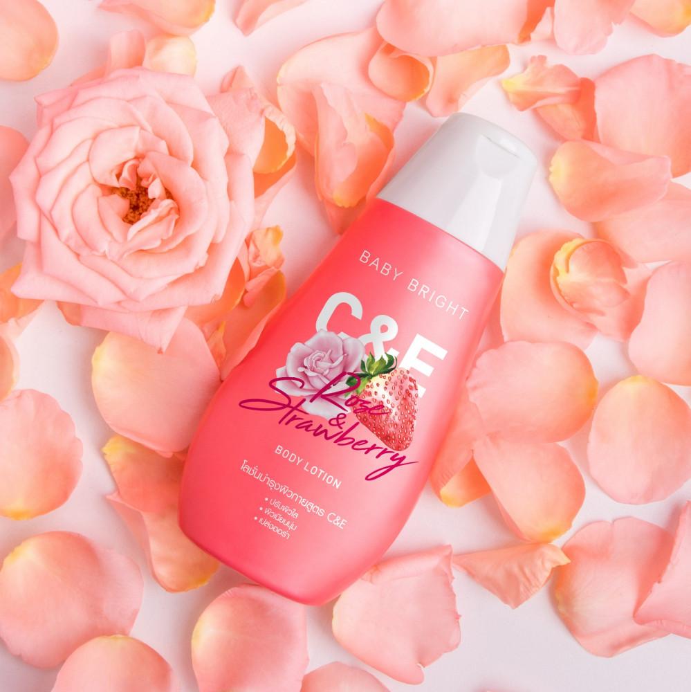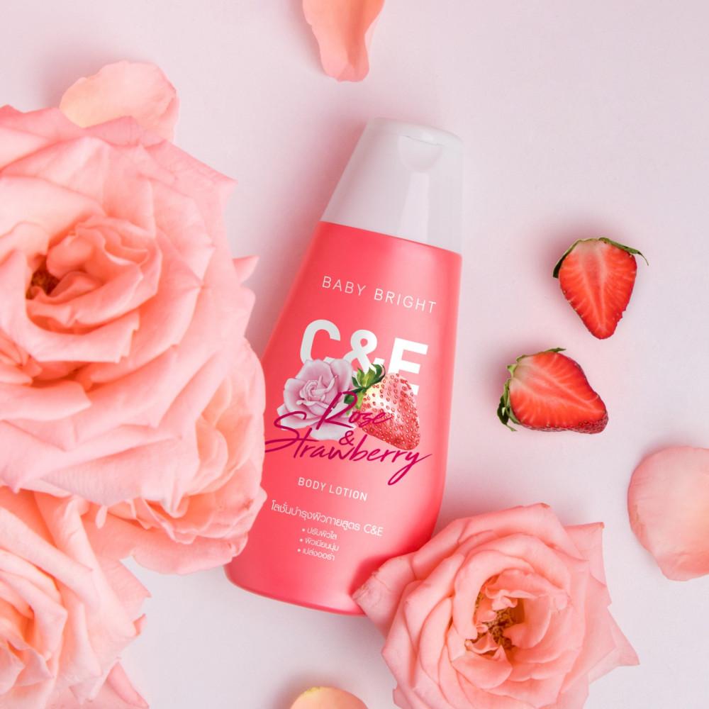 بدي لوشن سي آند اي بالورد و الفراولة من بيبي برايت غني بالفيتامين C من الفراولة، الذي يساعد على تقليل ظهور البقع الداكنة وتفتيح البشرة، كما أنه يحتوي على خلاصة الورد، التي تساعد على ترطيب البشرة وتجديدها. بالإضافة إلى ذلك، فإن بدي لوشن سي آند اي بالورد و الفراولة من بيبي برايت يحتوي على فيتامين E، الذي يساعد على حماية البشرة من أضرار الجذور الحرة.