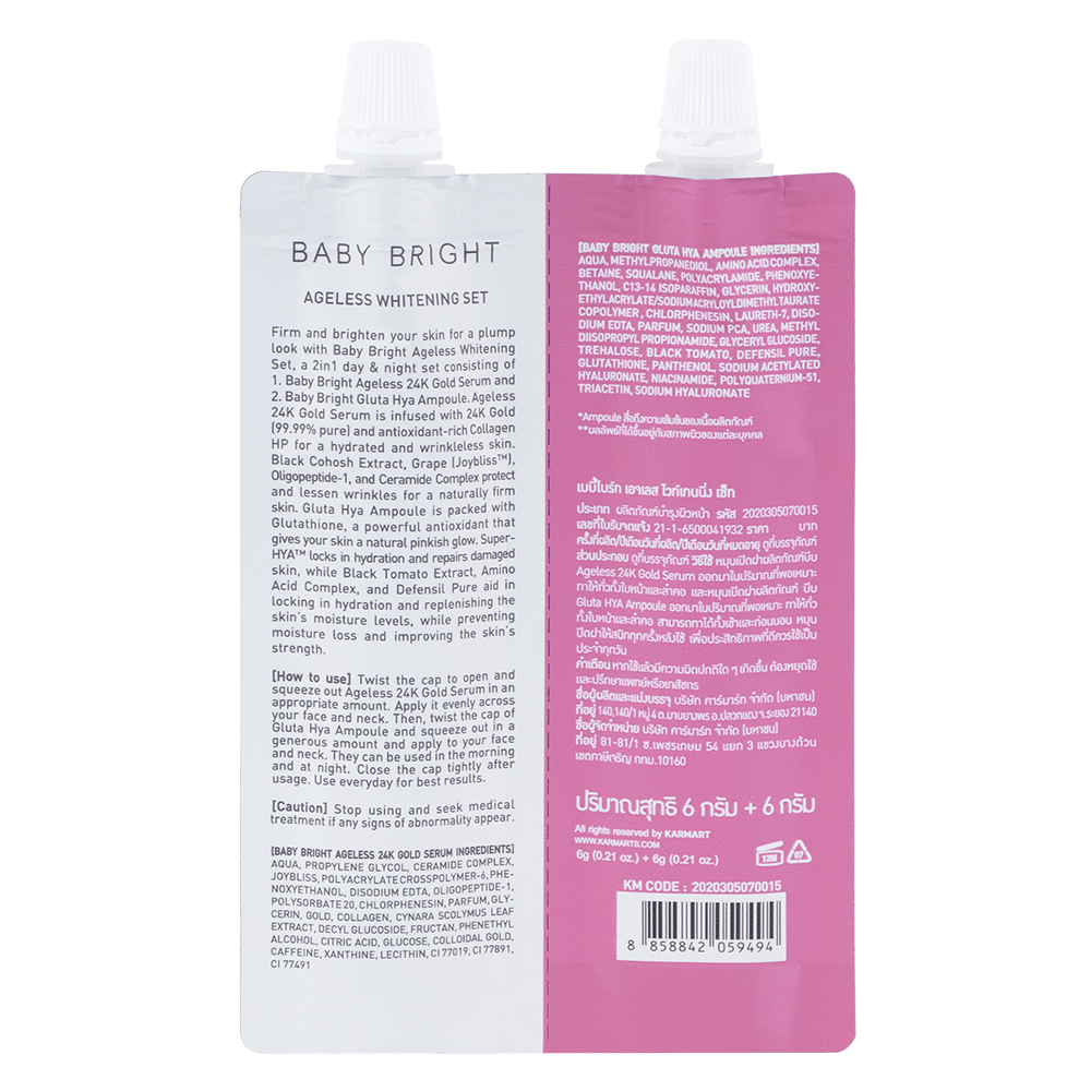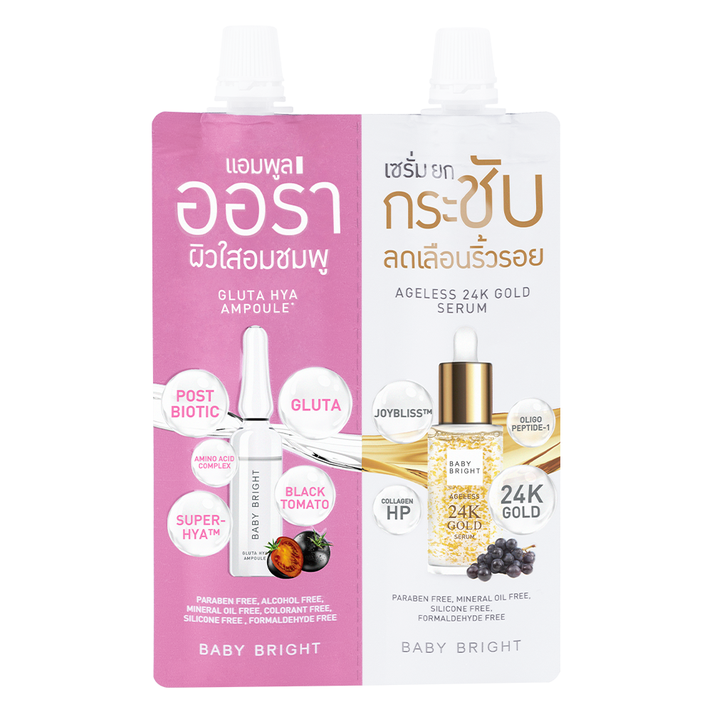 تمتعي ببشرة مشرقة وخالية من العيوب مع مجموعة التبييض Ageless من بيبي برايت. هذه المجموعة المتكاملة تجمع بين روتين العناية النهاري والليلي لتحصلي على أفضل النتائج. تحتوي على مزيج فاخر من مستخلص الكولاجين، مستخلص الذهب عيار 24، مستخلص الكوموش الأسود، مستخلص العنب، ومركب الأحماض الأمينية.